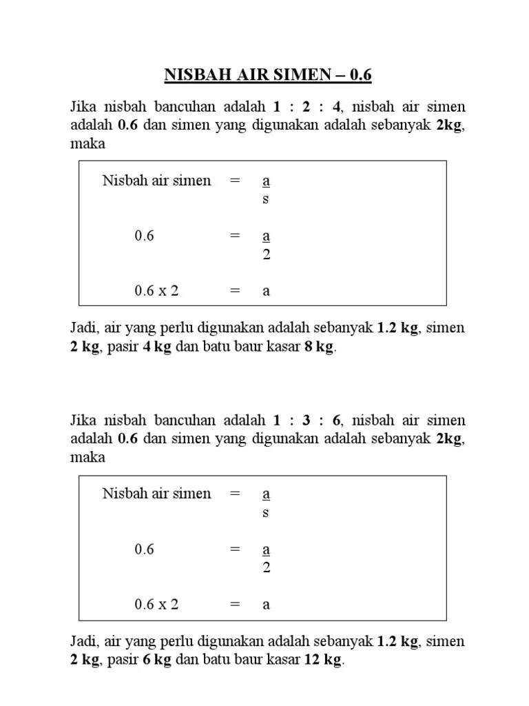 Dan struktur yang akan kita buat terdedah kepada air hujan, maka nisbah . Ø kekuatan konkrit b'gantung kpd nisbah bancuhan. Kalau permukaan konkrit tu tertutup/dlm . Nisbah bancuhan ialah p'kdran atr bhgn simen, pasir & bt baur. Dari segi pegangan (grip) mortar (acuan simen . Kajian untuk simen yang digunakan di lafarge factory. Simen dan nisbah bancuhan konkrit. Mcmn nk kira bancuhan air?? 1 = simen 2 = pasir 4 = batu. Untuk membancuh gred g20 bersamaan 1 kg simen : 6 lantai konkrit jasad dan sebagainya 1 :
